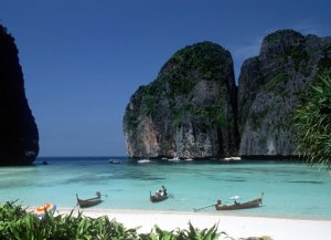 While you’re there, be sure to visit Maya Bay on Phi Phi Lei. That was the location for the movie The Beach. Touristy, yes. But well worth the trip. It’s breathtakingly gorgeous. Try and get a tour that skips most of the on-the-way stuff. If you can get in a snorkel for an hour at Phi Phi Lei, that’s enough. It’s better to just spend the time relaxing at Maya Bay. Here’s a pic.