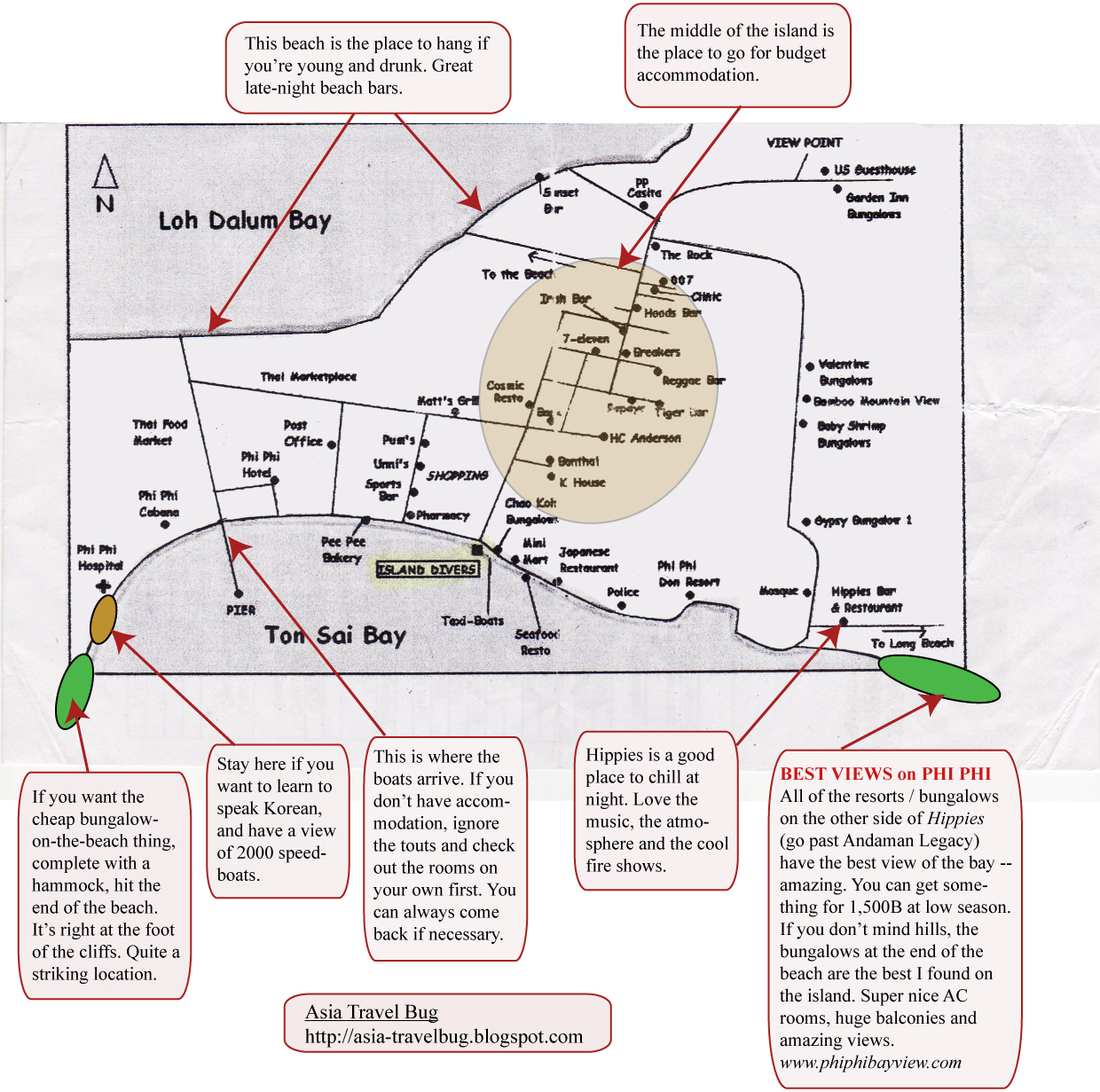 You and the other 5000 backpackers will all be staying on the tiiiiiny slip of land that exists between Ton Sai Bay and Loh Dalum Bay on the island of Phi Phi Don. Here’s a map that shows an overview of the main bits of Phi Phi Don.