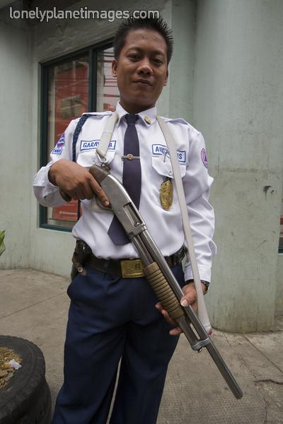 Armed guard must knock 20% points off the unemployment stats in the Phils. Even the guards in Starbucks and Macdonalds carry sidearms. In some ways, I like the security in a country where there are a few Muslim extremists who like to bomb innocent people. But it also freaks me out to see a gun in my face as the guard walks by me in Starbucks.