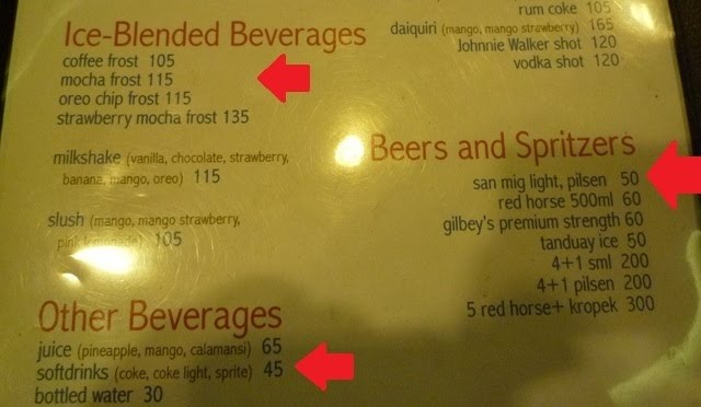 One thing I LOVE about being in the Philippines is the beer. It’s just so damned cheap. Here’s a menu from a relatively expensive place I was at in Cebu…50 pesos for a beer — about $1.15. You gotta love a country where beer is cheaper than foofy coffee, and about the same price as a coke.