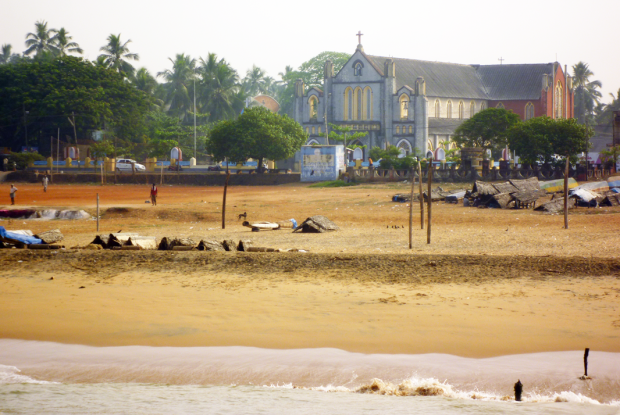 Standing on the pier gave me my first glimpse of the Indian sea shore — the Arabian Sea, to be precise (or, possibly imprecise; my geography sucks.) And looking back from the pier I could see the church shown below.