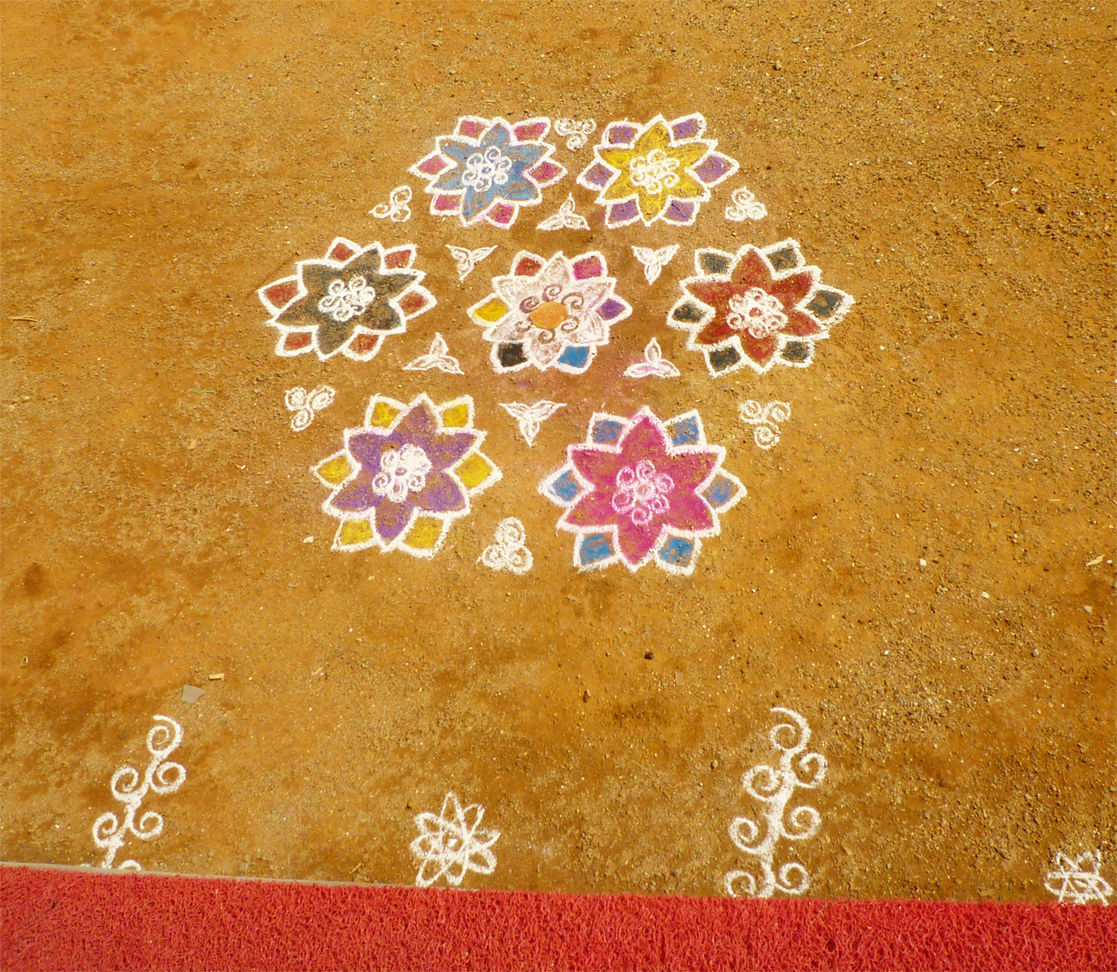 I have many fond memories of my 2010 work trip to South India and Kanya Kumari. One of my favorites was showing up to the office entrance every morning to find a freshly drawn colorful design. The Kolam.