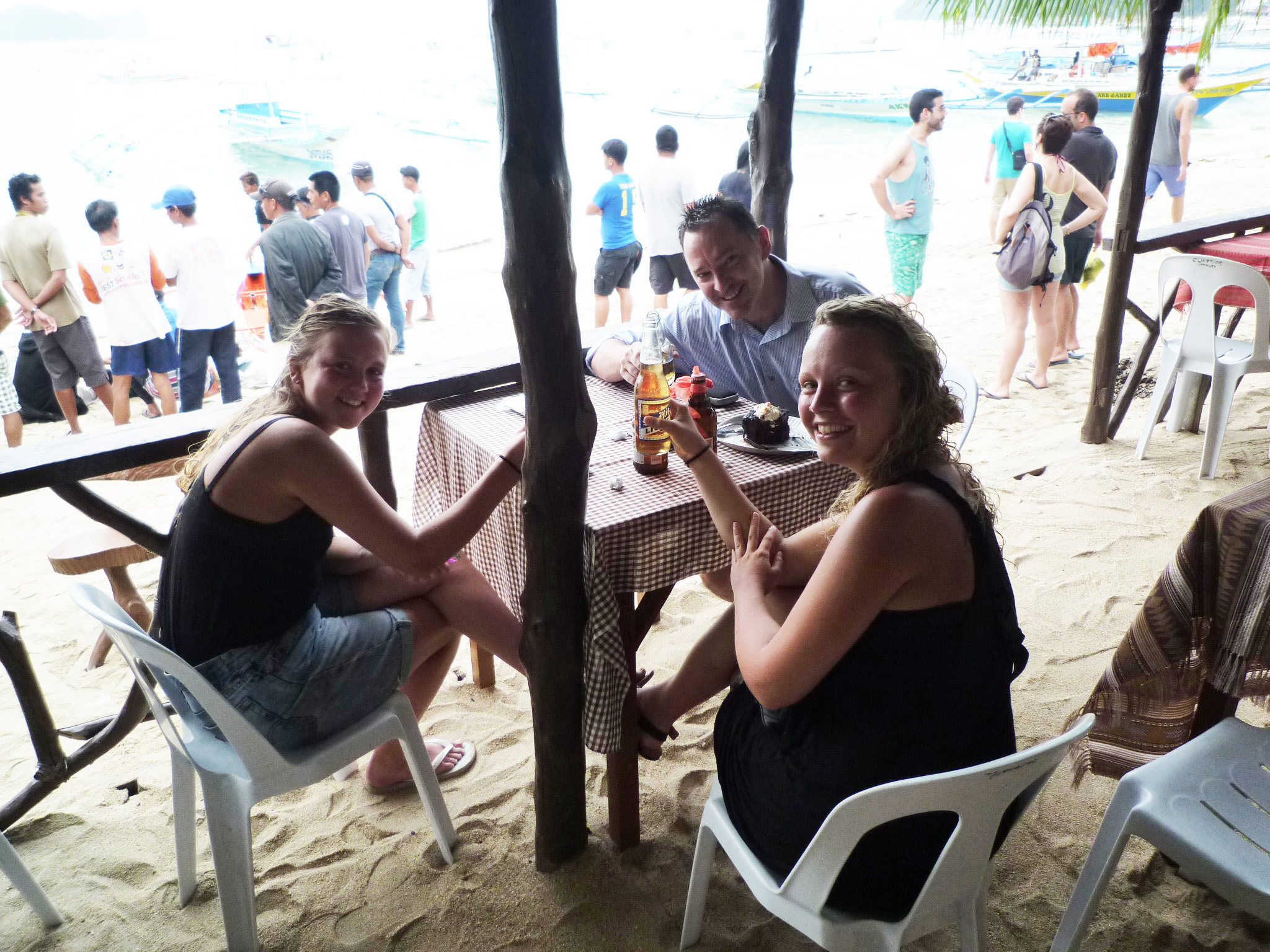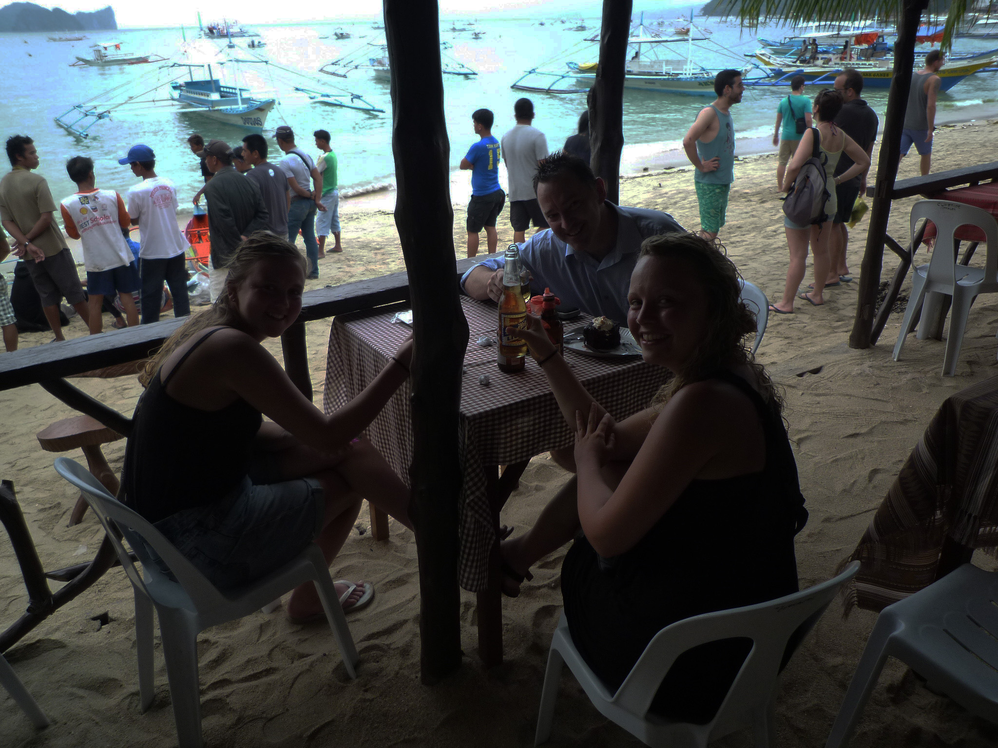 We had all been laughing and joking all day as we hopped from beautiful beach to beach, exploring cave after cave, so I felt quite comfortable telling them as we approached El Nido, “Actually, it’s my birthday today.” I told them of a pizza place I’d heard about and that I planned to find for my birthday dinner. “Everybody has to eat, so why don’t you join me for some good pizza and help me celebrate my birthday?” And so we decided to meet up for a few beers by the beach before moving to the restaurant. I was geeked!