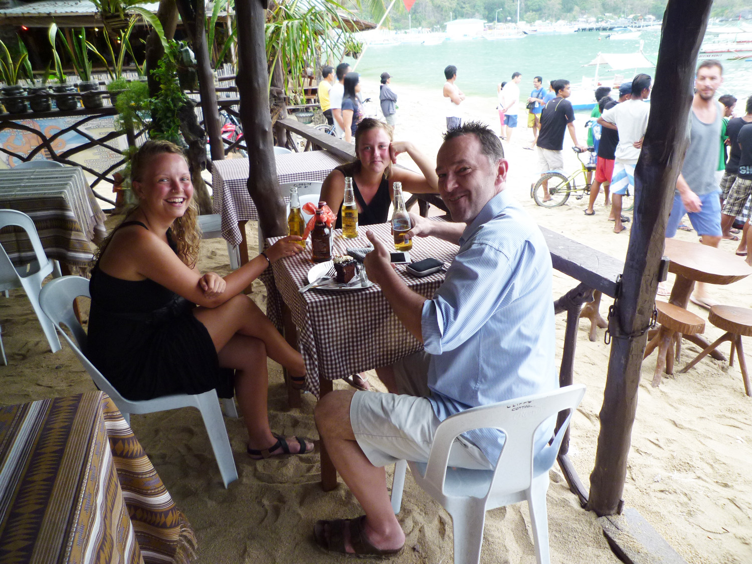 I was the first to make it to the beach bar, watching some home-made speed boats do their thing in the bay in front of El Nido. I spotted Marie and Amalie who had the most amazing birthday gifts in hand…a single piece of chocolate cake and two San Mig beers, complete with self-styled ribbons. I was speechless. Check out the most awesome and “lækker” piece of cake I ever remember eating.